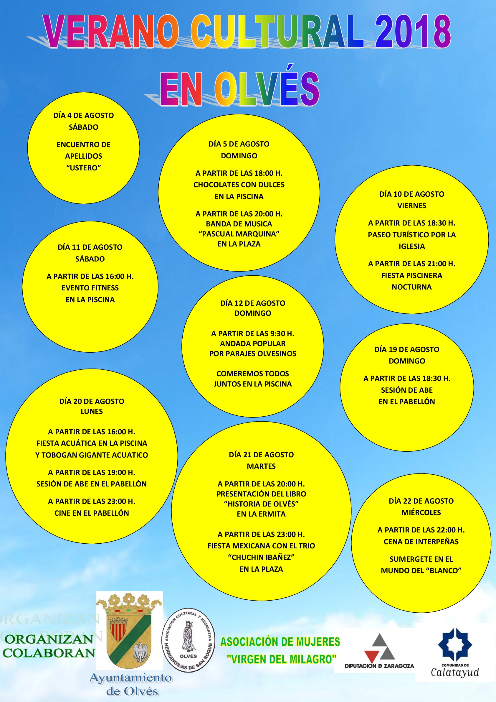 El “VERANO CULTURAL” 2018 ya se nos ha echado encima con muchismas, formidables, fantásticas, extraordinarias y variadas actividades tanto culturales como deportivas. Todas ellas con la organización y la colaboración del Excelentísimo Ayuntamiento de Olvés, de la Asociación Cultural y Recreativa “Hermanos y Hermanas de San Roque”, de la Asociación de Mujeres “Virgen del Milagro”, de la Diputación Provincial de Zaragoza y de la Comarca “Comunidad de Calatayud”